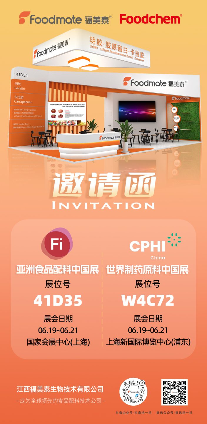 福美泰生物始终坚守品质至上的原则,致力于为客户提供优质、安全、健康的天然原料和食品配料。此次展览,我司将展出明胶、卡拉胶、胶原蛋白(功能性动物蛋白)等明星产品。