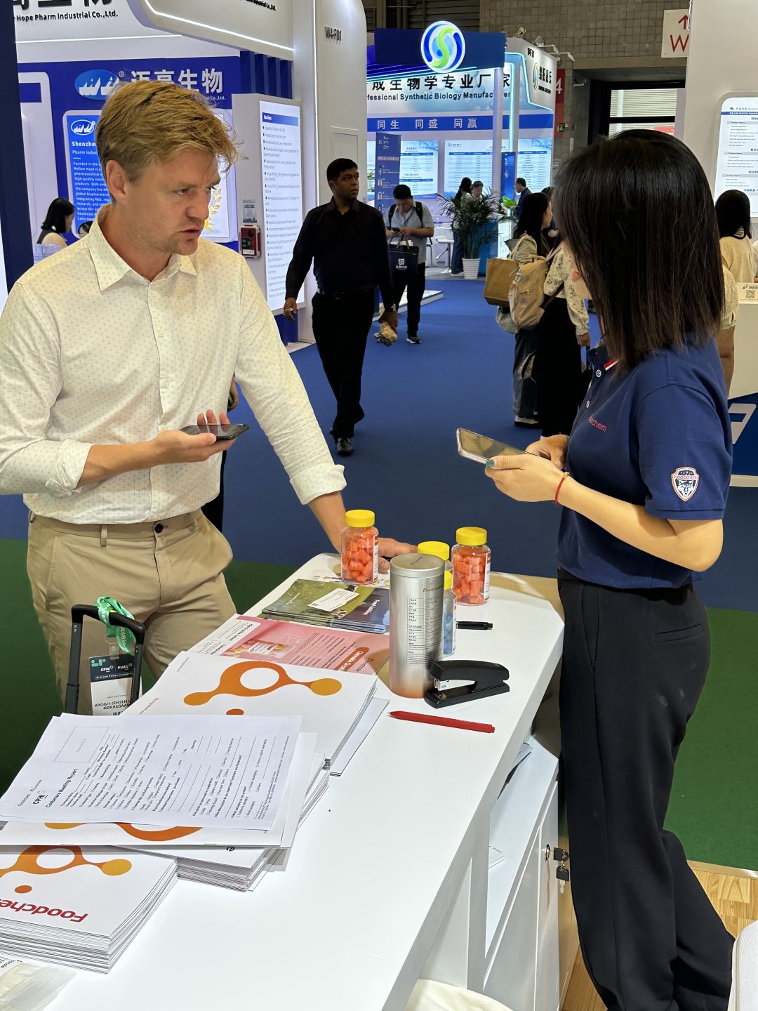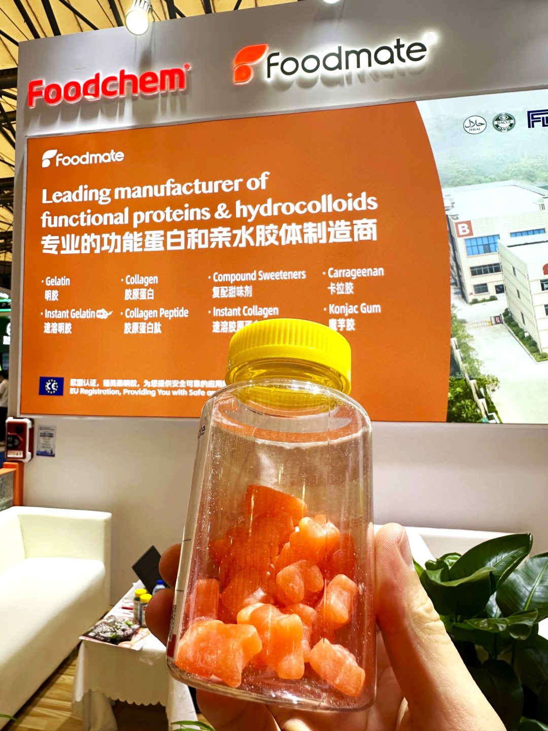 人潮涌向明胶! 展会三日,两大展位最火爆的区域非明胶产品展示区莫属!来自全球各地的终端品牌商、大型贸易商、知名药企代表等纷纷慕名而来,目标明确——寻找高品质、高稳定性的明胶解决方案。无论是追求晶莹剔透、Q弹完美的功能软糖,还是需求密封成膜、精准释放的软胶囊,福美泰都能提供一站式胶体解决方案。我们精选牛皮、牛骨及优质鱼类为原料,打造食用明胶FoodGel™系列和药用明胶CapGel™系列,冻力范围从120到300 Bloom g,可为食品提供良好的结构和质地。