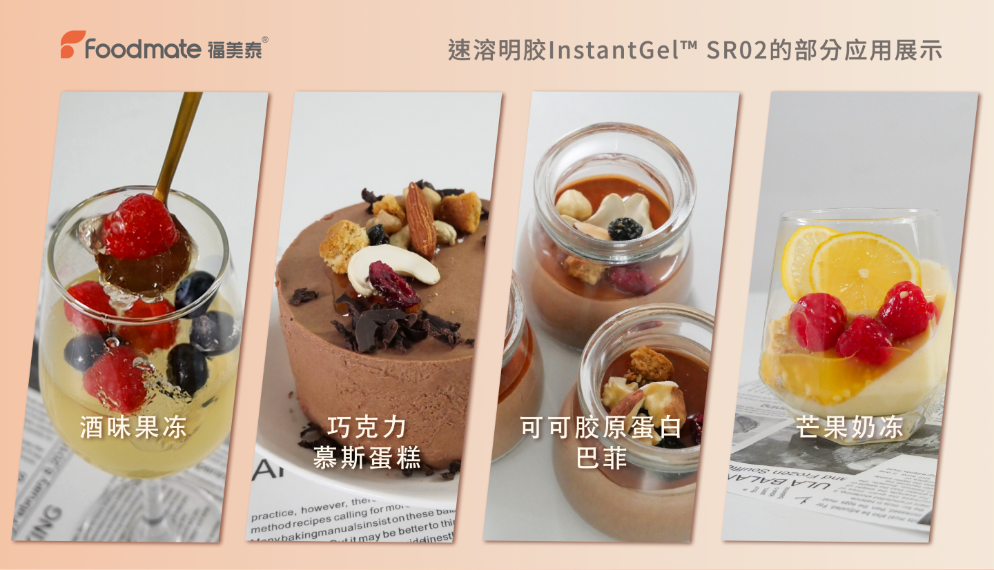 - 明胶系列:天然安全,改善食品质地与口感,广泛应用于慕斯、果冻等。